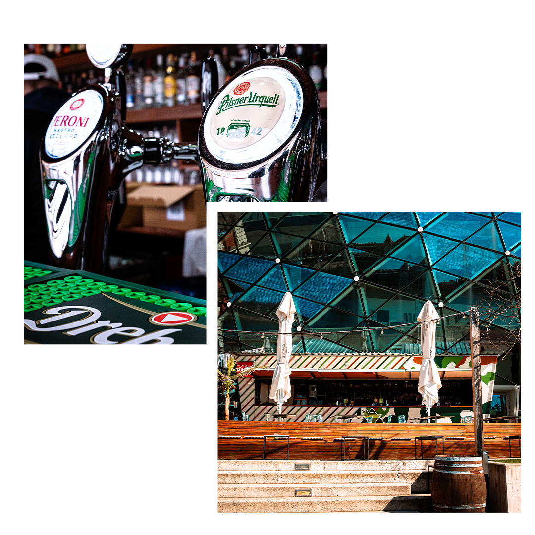 Teraszunk a modern dizájn és a relaxáló környezet ötvözete, ahol a városi élet pezsgése és a természet nyugalma kéz a kézben jár. Frissítő italaink gondoskodnak a tökéletes hangulatról.